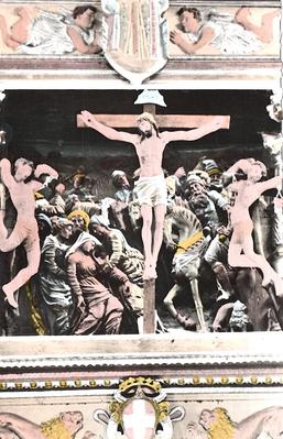 BG 4 - Utelle (A.-M.) - Alt. 800 m. Eglise St-Véran - Retable de la Passion (fin XVIe s.), en bois sculpté - La Crucifixion