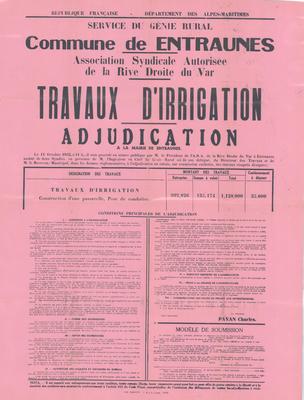 Adjudication - Réfection du canal d'arrosage de la rive droite du Var - Entraunes, 1934