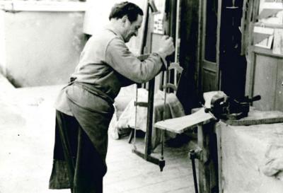 Jean Ros fabriquant un bât : découpe d'un arceau dans une planche de hêtre.