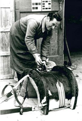 Jean Ros fabriquant un bât : Couture d'une peau de veau pour l'habillage du bât.