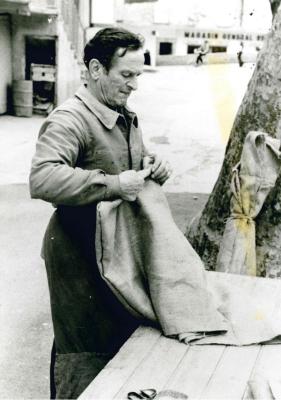 Jean Ros fabriquant un bât : préparation de la toile pour les coussinets.