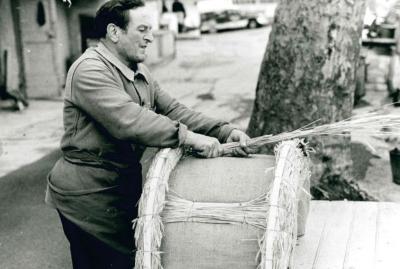 Jean Ros fabriquant un bât : habillage du bât avec de la paille