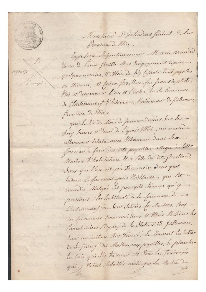 Déclaration d'incendie; Pétition en faveur de la veuve Graille - "(À l'intention de) Monsieur l'intendant général de la province de Nice"