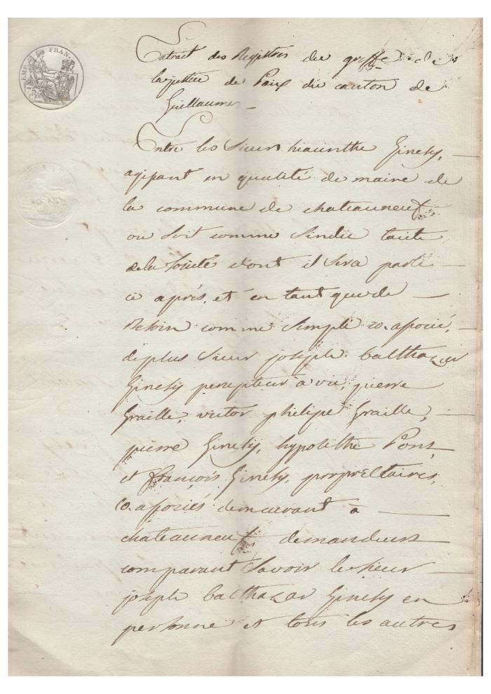Procès de quatre habitants de la commune de Chateauneuf -"Extrait des registres du greffe de la justice des paix du Canton de Guillaumes"
