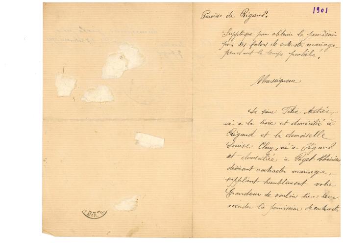 Paroisse de Rigaud Supplique pour obtenir la permission pour les futurs de contracter mariage pendant le temps prohibé. 1901