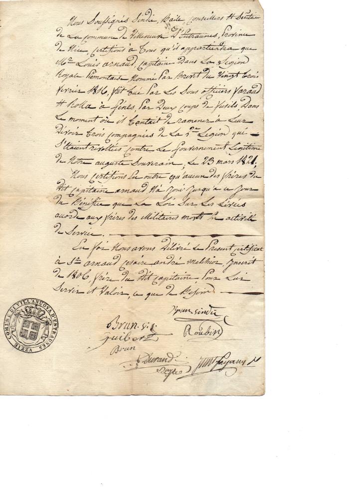 Attestation de décès de Louis Arnaud - 1821