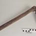 Description : Lame triangulaire, affinée en pointe vers l'extrémité, incurvée vers le manche munie d'une nervure (Lg : 1 cm ). Oeil quadrangulaire aux angles arrondis. Manche artisanale cylindrique perpendiculaire au fer.