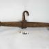 Description : Pièce de bois (D : 7 cm) allant en s'effilant vers les deux extrémités pour atteindre 5 cm de diamètre. A chaque extrémité est enchâssée une bague maintenue en place par des clous recourbés. A chaque extrémité de la pièce de bois, une tige de métallique est plantée dans l'axe pour agrandir le diamètre. Chaque bague est prolongée par un crochet forgé. Un centre de la pièce se trouve un anneau ovale maintenu en place par quatre clous forts et recourbés. Cet anneau supporte le crochet de fixation à la charrette à tirer. Ce crochet est diamétralement opposé aux crochets d'extrémités.