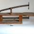 Description : Outil composé de : a/ un bâti en bois, comportant a1: un socle parallélépipèdique (51 x 16 x 2,7 cm) horizontal, supportant a2) deux pieds verticaux fixés sur les petits côtés du plan rectangulaire de (a1) (H 15 cm, Lg 7 cm, ép : 6 cm), fendus dans le sens de la hauteur pour laisser libre passage à b) ; a3) une planche supérieure (L : 79 cm), Lg de 14,5 cm sur 51 cm de sa longueur, puis s'élargissant vers son extrémité (Lg : 21 cm); Ep : 1,8 cm. La partie large est percée, en son milieu, d'un trou circulaire (D : 1,3 cm). La partie étroite comporte perpendiculairement au sens de sa Longueur un support vertical chantourné (H : 13 cm, Lg maxi base 11 cm, mini H : 3,5 cm, ép : 2,7 cm), fendu verticalement en son milieu pour qu'il joue librement (b), en tout cas sa partie supérieure ; b/ un support de lame en fer (L : 63,5 cm) courbé en forme d'épingle à cheveux, composé d'une lame dont le plat est vertical (Lg lame 3,2 cm, ép : 0,5 cm). Ce support est fixé sur le bâti-bois, au niveau de l'arc, par un axe en fer (L : 11 cm D : 0,3 cm), il comporte, perpendiculaires à chacune de ses extrémités, deux pièces métalliques, b2) (fixée à la branche supérieure)(L : 15,5 cm , D maxi 1,2 cm) dotée d'une clef de serrage dans sa partie inférieure, et b3) (fixée à la branche inférieure) (L : 9,5 cm, D maxi 1,2 cm), dotée d'une clef de serrage dans sa partie supérieure. La Lame de scie, manquante, est fixée entre b2 et b3 et passe dans l'orifice circulaire pratiqué au milieu de la partie large (a3) ; b4) est un ressort de rappel du support de lame, fixé sur le bâti (a1), c'est une lame courbe (L dvp 21 cm, Lg : 3 cm) ; d) pédale de bois fixée par un crochet au support inférieur de la lame, qui donne le mouvement à la scie, et est constituée de d1) une planche-socle (11,5 x 23 cm ép : 2,5 cm) présentant, au milieu dans le sens de la largeur sur les côtés, deux échancrures (5x2 cm) qui accueillent d2) deux supports verticaux (H : 7 cm, 5 x2 cm) dont la partie supérieure maintient d3) un axe en bois (L : 11,5 cm, D 0,1 cm) perpendiculaire au sens de la longueurde (d1) sur lequel est fixée d4) une planchette (25 x 11,3 cm ép : 1,4 cm), échancrée latéralement au milieu de sa longueur (6,( x 1,8 cm) , et qui tient lieu de bascule.