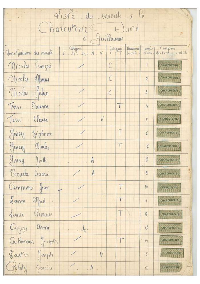 [Liste des inscrits à la charcuterie David à Guillaumes - cahier de coupons de rationnement utilisés - 1941]