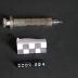 Description : Le corps de la seringue a un embout en métal fixé sur un embout en verre. Le cercle de l'ouverture est aplati sur les deux côtés pour s'opposer au roulement sur un plan horizontal. Il est gradué de 0 à 5 cc avec des graduations intermédiaires.