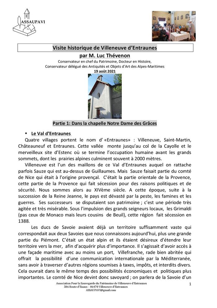 Description : 1ère partie d'une conférence donnée par Luc Thévenon lors d'une visite historique de Villeneuve d'Entraunes organisée par L'Association pour la Sauvegarde du Patrimoine de Villeneuve (Saupavi) 1. Après une introduction historique sur l'origine de peuplement de Villeneuve et les différentes fonctions de la confrérie des pénitents, Luc Thévenon présente la chapelle Notre-Dame-des Grâces et analyse notamment le tableau de Jacques Viany (1638) représentant la Vierge et l'enfant et où figure la fameuse tarasque.