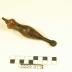 Description : Monture à étrier en laiton armée d'une roulette ( D : 1,7 cm) rainurée sur 0,2 cm et avec un tranchant éffilée ; manche en bois tourné. Soie noyée maintenue. Une pièce de cuir permet de suspendre l'outil a un établi.
