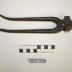 Description : Pince avec articulation en "X" avec mâchoires coudées. Les extremités des mâchoires à mors droits sont quadrillées à encoches puis dentées tranversalement. La mâchoire supérieure est armé d'un marteau à table carrée(1,2 cm de côté) quadrillée.