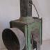 Description : Boîte rectangulaire peinte en vert surmontée d'une tour de ventilation peinte en noir de section circulaire coiffée d'un couvercle conique pivotant. Sur une face un cône ouvert extérieur sert de diffuseur de la lumière, la face opposée est munie d'un cône intérieur. Une des faces latérales a un crochet de suspension. La base repose sur un cône tronqué qui doit recevoir le réservoir à pétrole